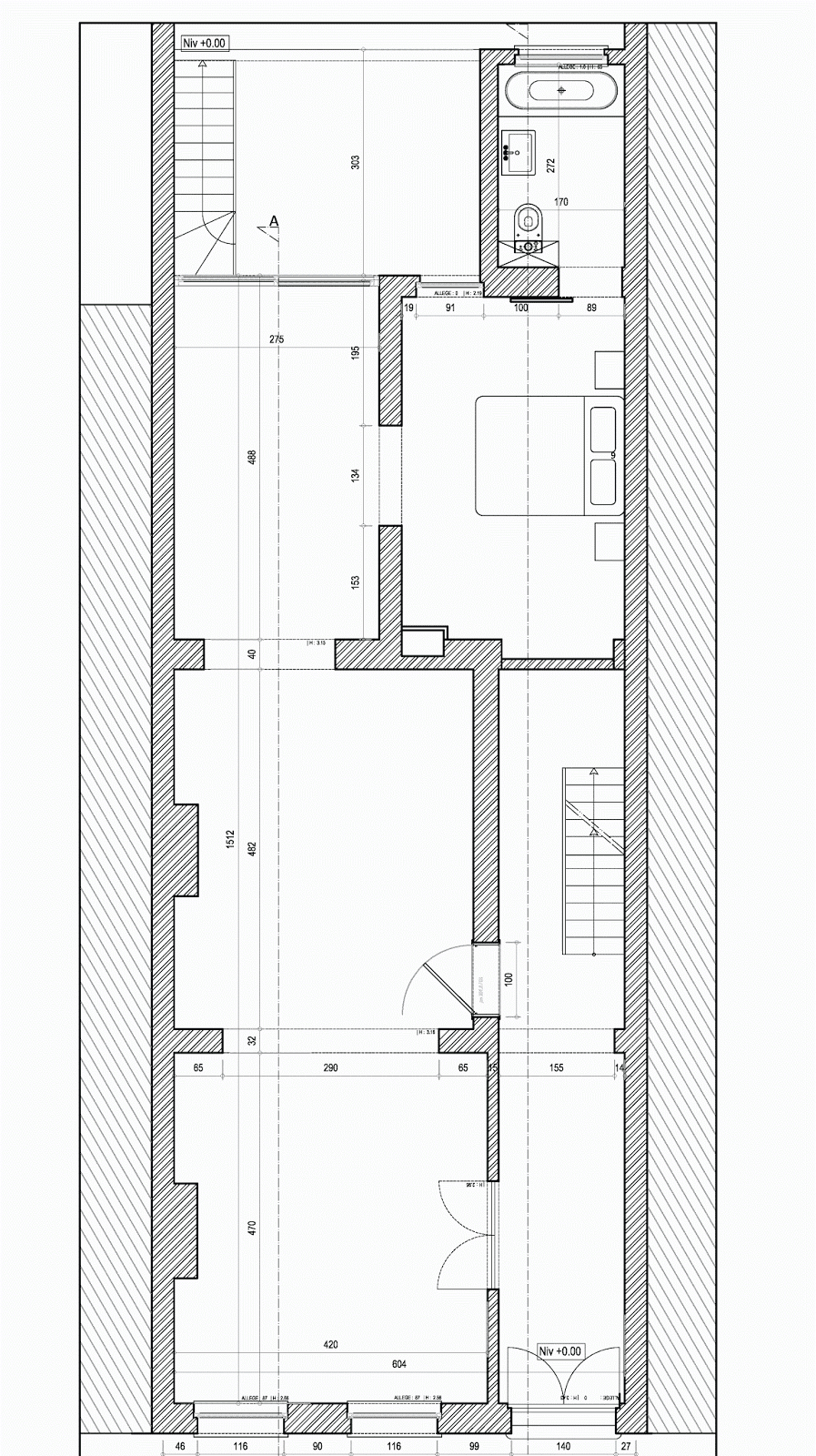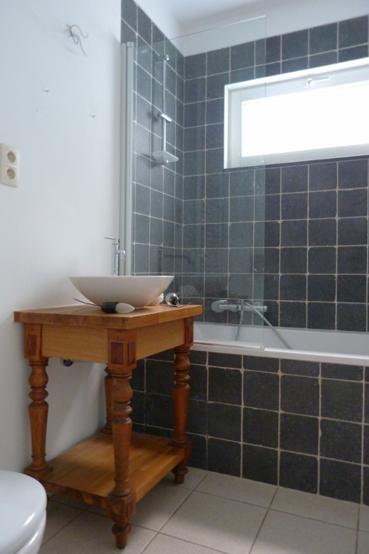 Finally to the right of the kitchen, you access the bedroom and, through there, the bathroom. Yes, I know, for most people this might not be an ideal set-up, as guests have to go through the rather private bedroom if they want to make it the loo… But - not to boast here - I’m probably not most people… For years I’ve been showing bedroom, bathroom and various private parts (of my home !) all over the web. So “privacy” is a relative notion as far as I’m concerned. Anyway. Trust me. I already have some ideas on how to improve this layout in any case.