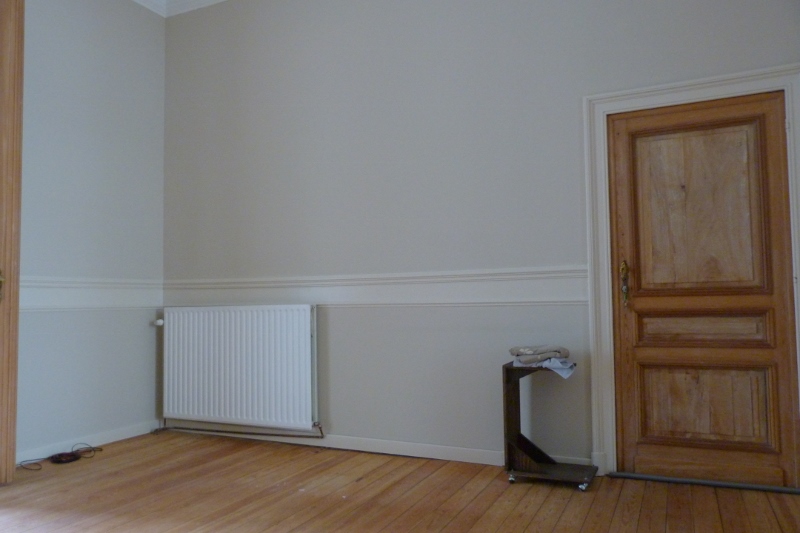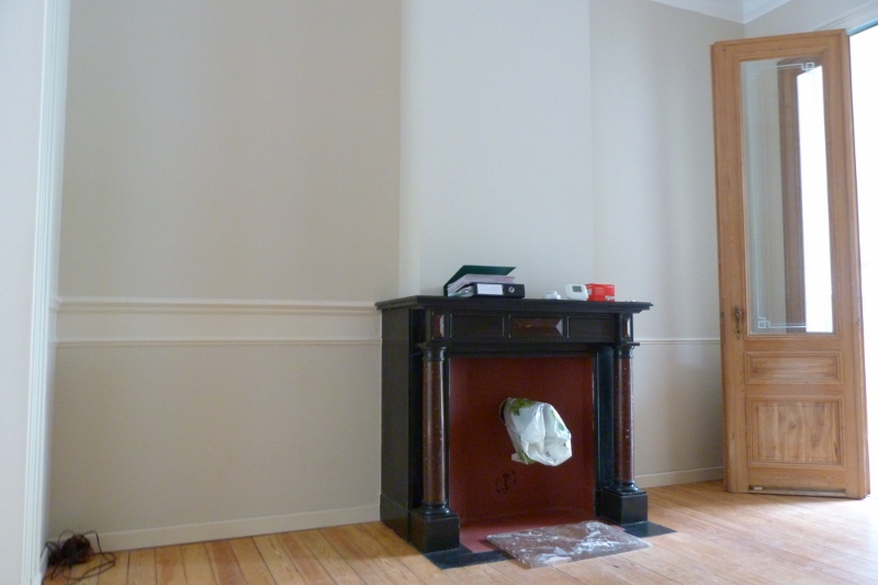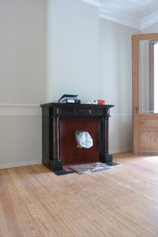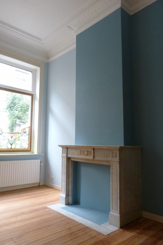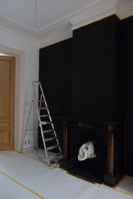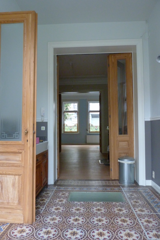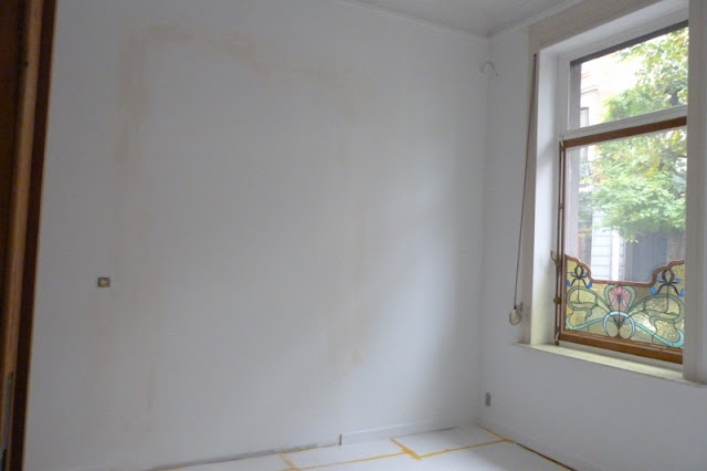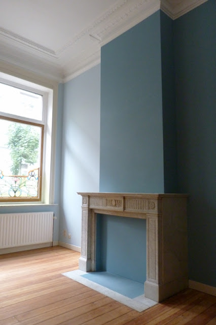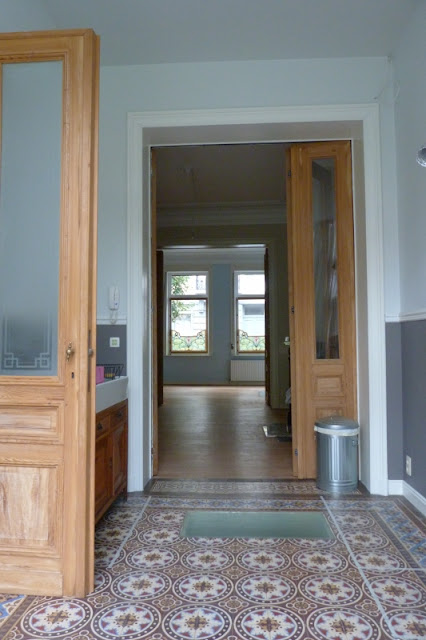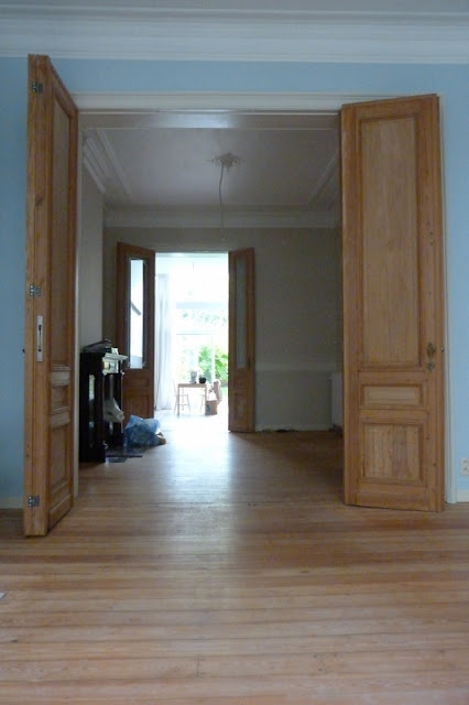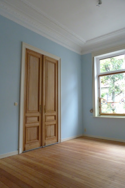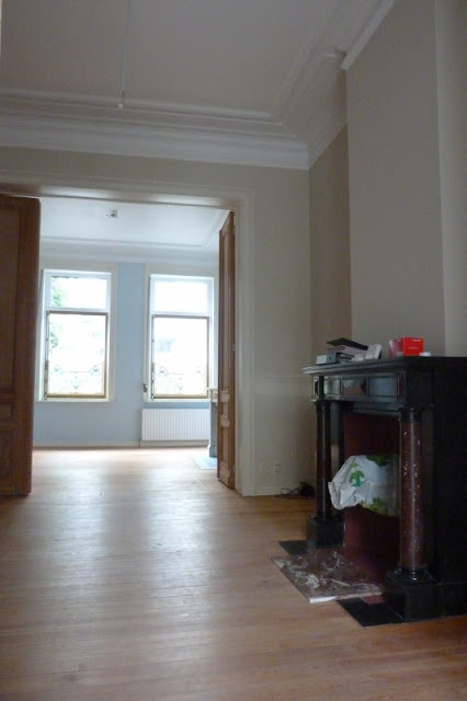 It has a classic layout for a Brussels apartment, in that it has 3 enfilade rooms - sort of a 19th century idea of an open floor plan - with a bedroom and a bathroom in a lateral annex (the bathroom annex usually being a later addition). One room flowing into another and those amazing doorways aligning with each other, definitely is a lovely feature. It does however present certain design challenges as well - the most important one being the lack of natural light in the middle room. But more on that another time.