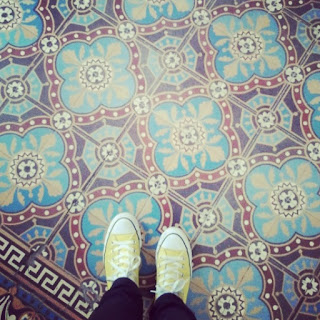 Let's start our tour with the front room (the one at the bottom of the floor plan). In previous posts it appeared in all its baby, ehem, light blue glory. It has two beautiful oak frame windows towards the street (the ones with the art nouvau flower patterns), an awesome white marble fireplace (sadly non functioning) and it used to have an original double door towards the building hallway, which I had moved to close off the wall behind