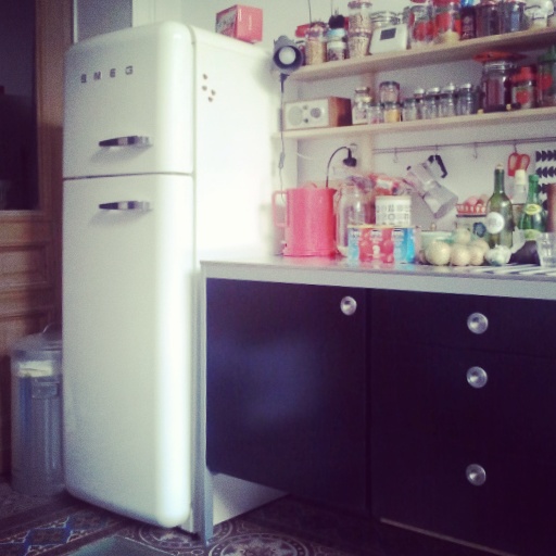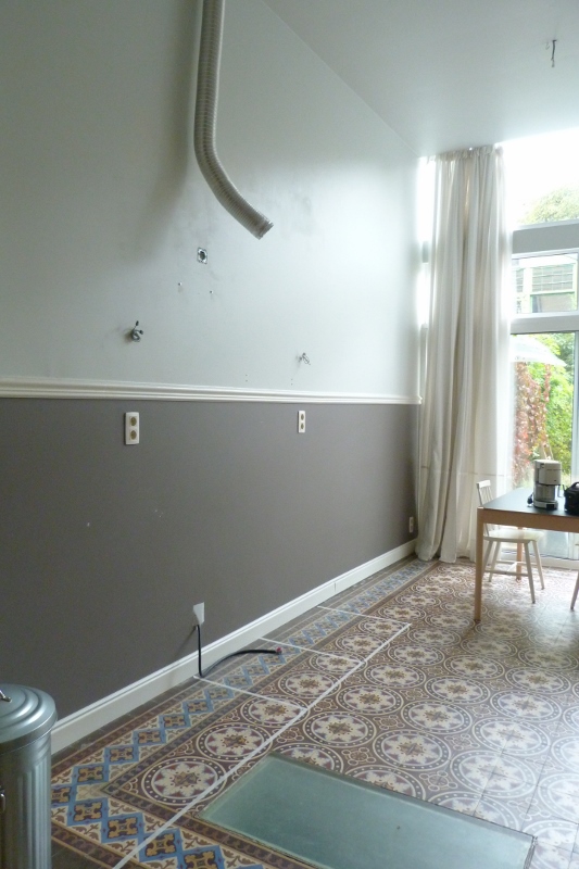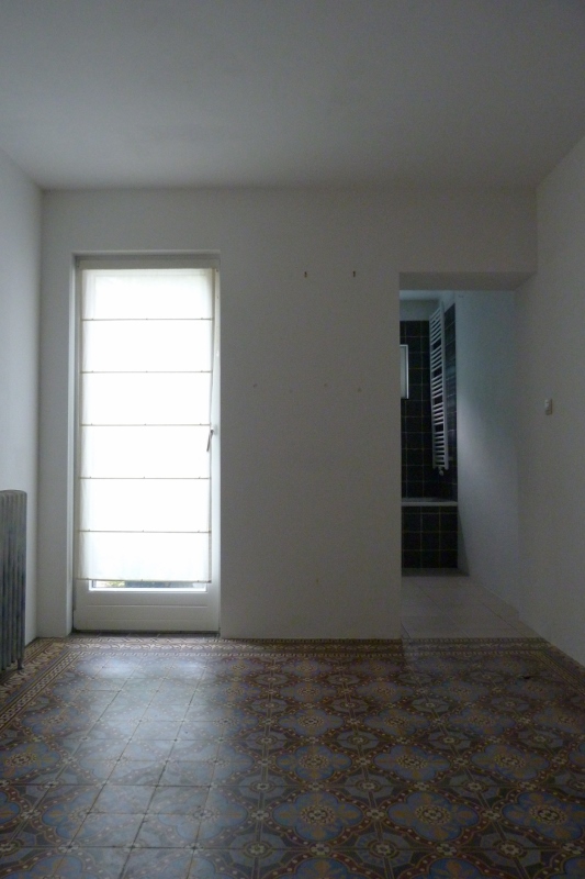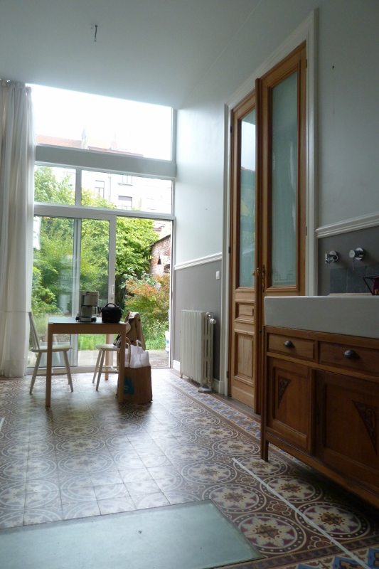 Moving along to the back of the apartment (towards the garden), in the third - but much narrower - en-suite room, you will find the kitchen. This room has amazing cement floor tiles and the best light of all, thanks to large sliding doors to the outside. When I moved in, it was however nearly empty and I had to have a new/temporary kitchen installed. As it turns out, not as fun as it sounds… Definitely more on that at a later time.