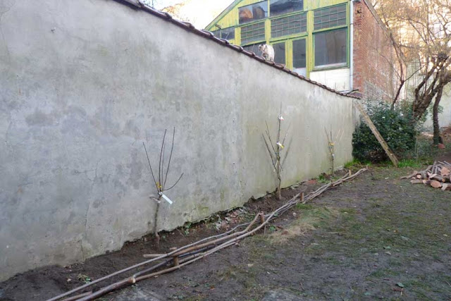 So here's the plan. Basically, I’m going to split up this garden into two parts with a very different look and feel. The front part (close to the house and terrace) will be a kitchen and ornamental garden, with espaliered fruit bushes and trees on the left, south-facing wall (as seen here), a big vegetable patch in the middle (so it would have been bye-bye lawn anyway)and a big herbaceous border to the right.